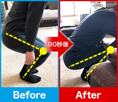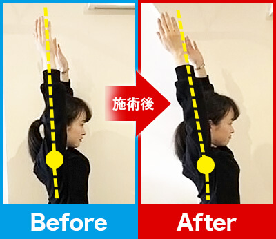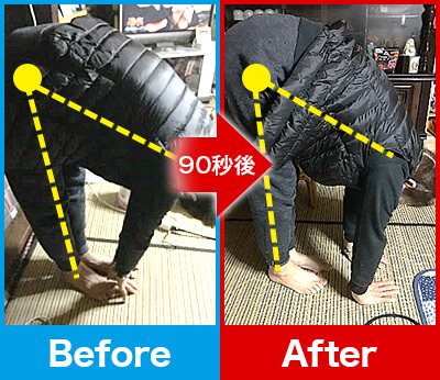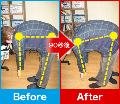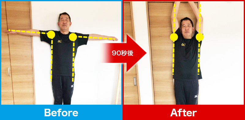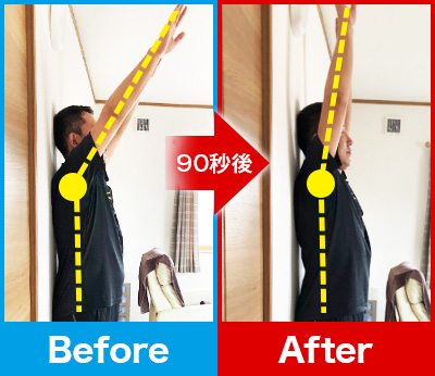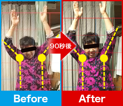 90秒後、先ほどまであった肘・肩の痛みや腕の重だるさが一気に消失!